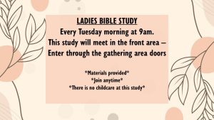 Our Tuesday morning Ladies Bible Study runs from September through May of each year. They meet at 9am on Tuesday Mornings. All study materials are provided.